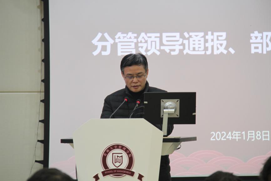 李烨院长通报总结2023年度管理学院推进的主要工作和取得的成效,表扬并肯定全体教职工2023年度的工作成果,同时也指出部分不足之处,鼓励学院全体教职工继续奋斗,在新的一年里再接再厉,有所突破。