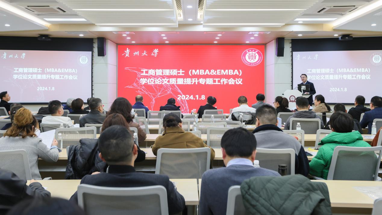 202418日,工商管理硕士(MBAEMBA)学位论文质量提升专题工作会议在院三楼报告厅召开。此次会议由管理学院院长李烨教授主持。贵州大学党委正处级组织员、管理学院党委副书记(主持党委工作)周莉莉教授,管理学院副院长(正处级)李本光教授,贵州大学人民武装学院副院长、管理学院副院长(正处级)王婷教授,MBAEMBA教育中心主任、副主任,校内外工商管理硕士生导师共60余人参加会议。
