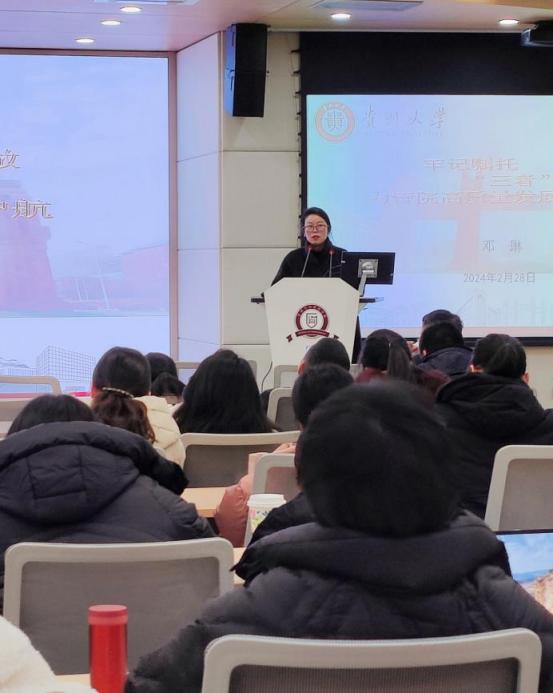 随后,校党委正处级组织员、院党委副书记(主持党委工作)周莉莉带领全体教职工开展政治理论学习,主要学习了习近平总书记在二十届中央纪委三次全会上深刻阐述的党的自我革命的重要思想。同时,周书记还传达了 2024年贵州大学春季学期工作会议的重要讲话精神。