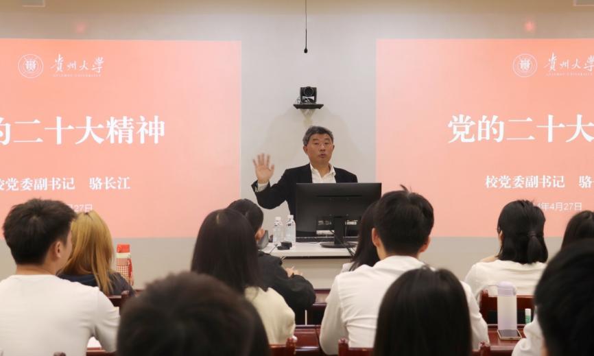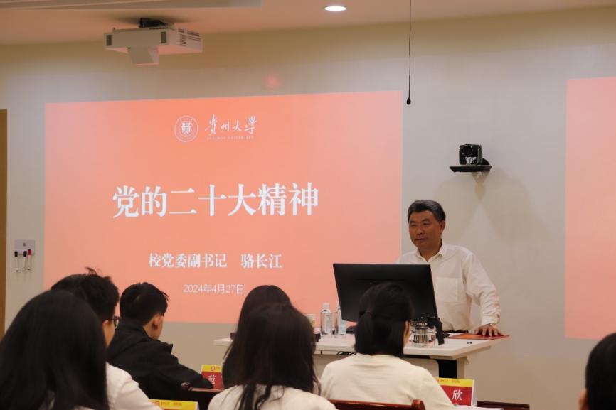 2024年4月27日上午,贵州大学管理学院分党校第四十期入党积极分子专题党课——党的二十大精神,在管理学院致远楼402教室举行。贵州大学党委副书记骆长江担任主讲人。