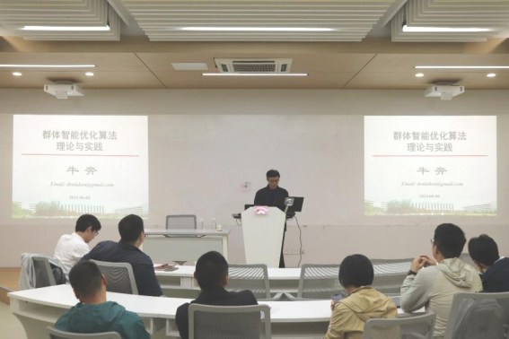 讲座第二项,群体智能。他强调,群体智能,是新一代人工智能的重要领域。国务院于2017年7月8日印发并实施《新一代人工智能发展规划》,其中介绍了新一代人工智能发展的五大重点方向,第二重点方向即群体智能。牛奔教授还介绍了自然界中的群体智能,如蚁群的沟通与决策、蜂群的筑巢行为、鸟群的飞行队形、细菌的游动和翻转等,由此引入群体智能优化算法:粒子群算法、蚁群算法、蜂群算法、细菌觅食优化算法等。