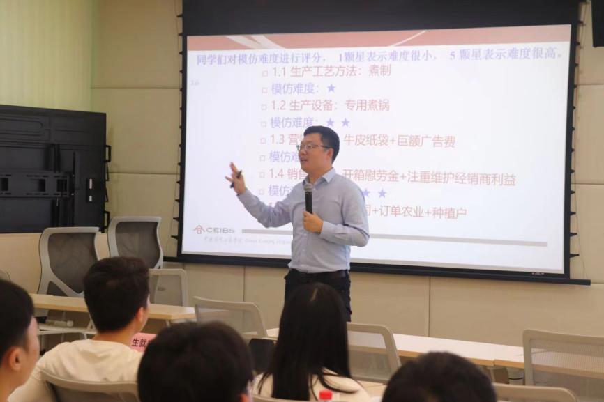 讲座随后正式开始。陈炳亮博士首先分享了多个成功的教学案例。随后以恰恰食品集团为例,带领现场师生进行详细分析和探讨。现场师生基于对案例的阅读,在陈炳亮博士的引导下,从恰恰食品的生产工艺、生产设备、营销推广、销售渠道和原材料来源的全过程进行分析,深入探讨了洽洽食品在行业内取得领先地位的原因,最后陈炳亮博士进行总结,强调了从源头到终端的全产业链整合在企业成功中的关键作用。