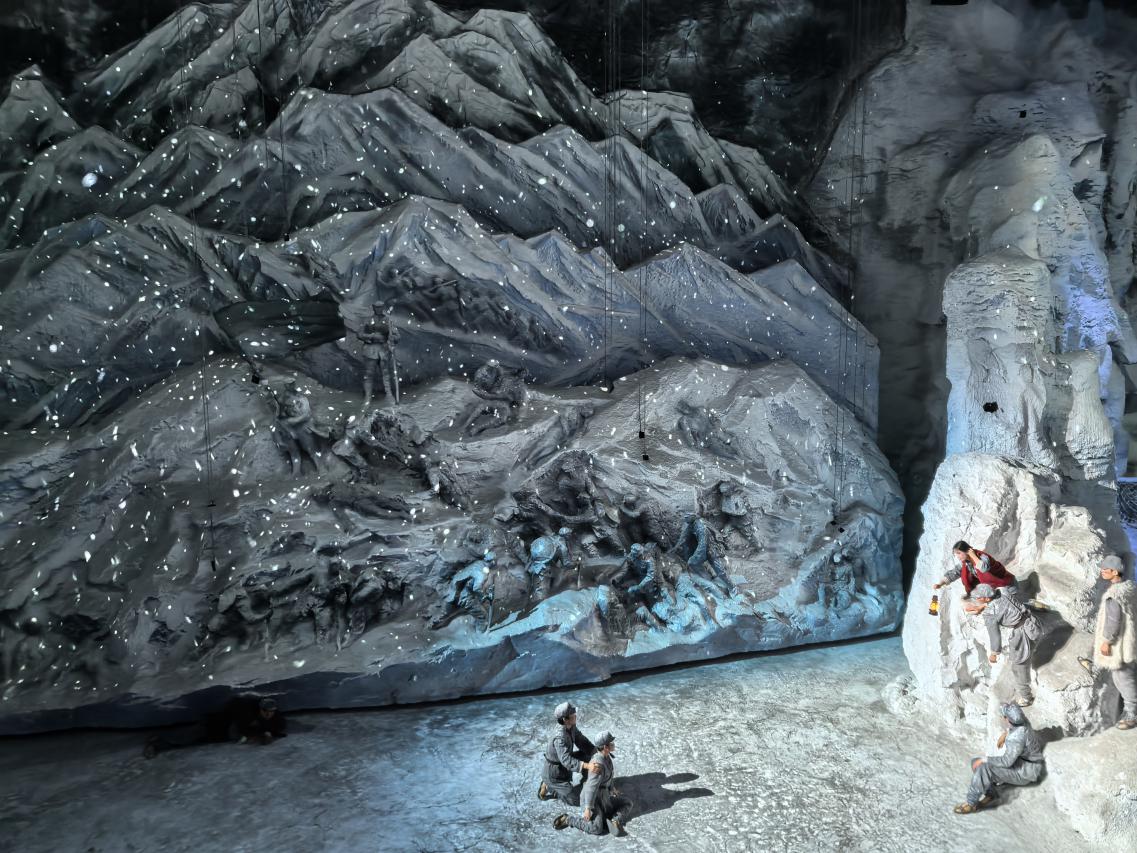 在“ 砥砺征途”篇章,学员进入雪山区域时,狂风暴雪迎面而来,随着阵阵的呼喊声,战士们的身影出现在崖畔上,如同雕塑般望向远方。通过感官真实传达,切身体会红军战士在崇高的革命信念和顽强意志下,与极其险恶的自然环境进行艰苦卓绝的斗争,倾听发生在长征路上可歌可泣的感人故事,亲身体验用双脚丈量“爬雪山过草地”的革命场景。来到“ 胜利丰碑”篇章,通过超大环幕剧场,展现红军会师的壮观场景。以“一面红旗、一盏马灯”作为跨越时空的核心线索,见证红军在长征中的信仰之路,并带领中华民族走进新时代。