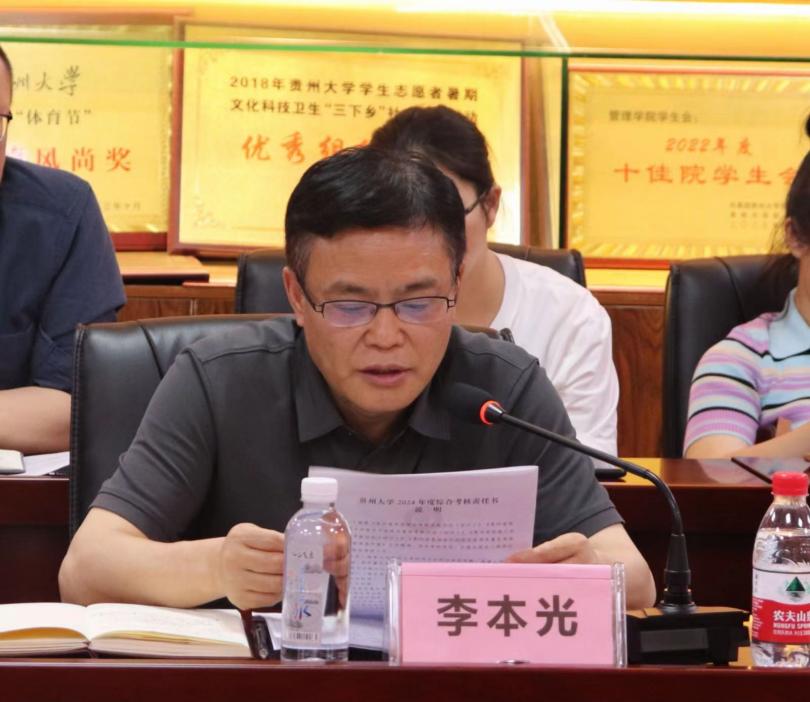 2024年7月1日中午,贵州大学管理学院在陈列室召开中层干部会议,学院党政领导、各科室(中心)负责人、教研室主任以及党支部书记参会,会议由管理学院院长李烨主持。