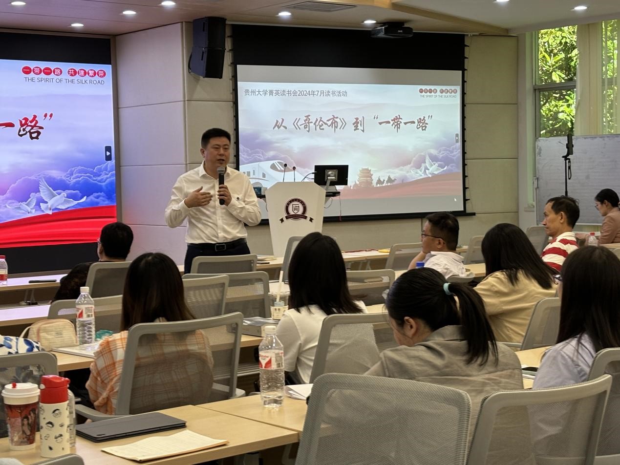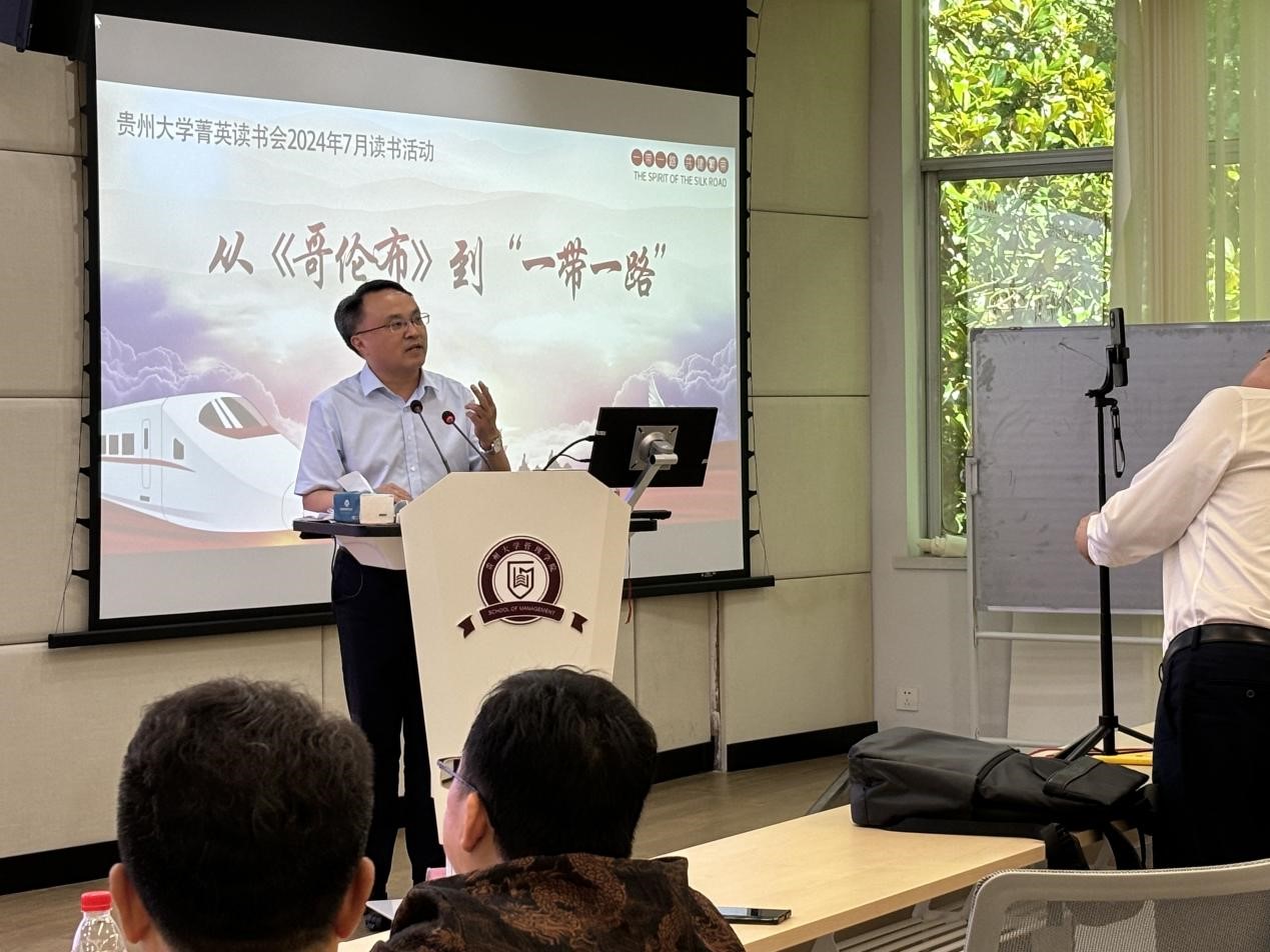 2024年7月6日,贵州大学管理学(EMBA&MBA&EDP)菁英读书会在管理学院三楼报告厅举办了主题为从《哥伦布》到“一带一路”的读书活动。本期读书由EMBA校友罗纲举(贵阳方舟科技有限公司总经理、读书会荣誉会长)分享。活动以现场分享、互动提问的方式让来自读书会和学院在读的MBA约40多名校友、同学参与到本次活动当中。贵州大学党委委员、贵州大学管理学院院长李烨出席了活动。活动主持人为读书会会长吴迪、读书会联合会长陈隽宁。