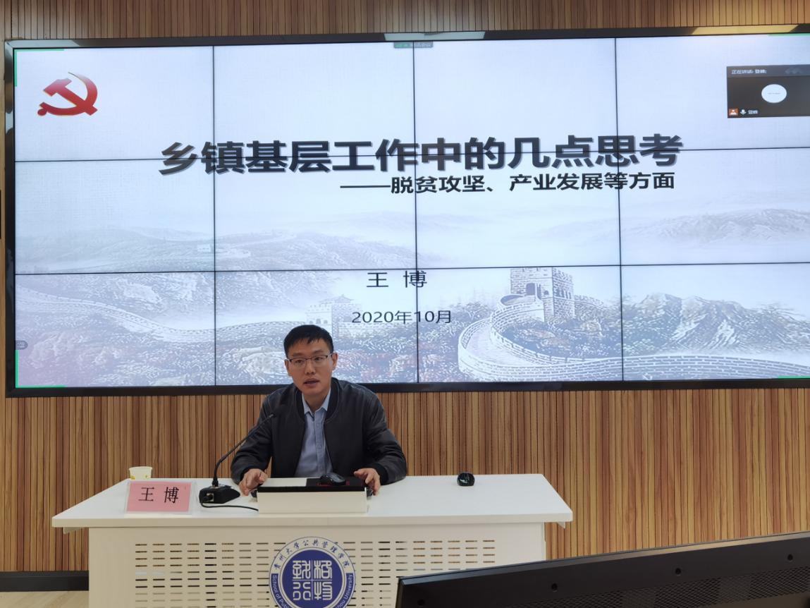 (MPA中心报道)2020年10月7日上午9:00,织金县上坪寨乡党委副书记,贵州大学公共管理学院优秀校友王博,受邀来到贵州大学公共管理学院,为MPA研究生做了题为“乡镇基层工作中的几点思考”的学术讲座。学院副院长王志凌教授主持了讲座,MPA2020级研究生线上线下共240余人听取了讲座内容。