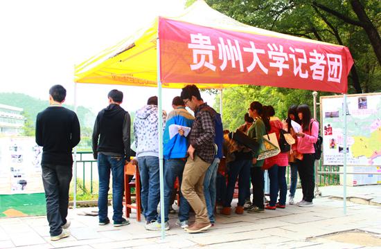 9月26日,蔡家关分团团友们在校区8号公寓旁如火如荼的搭起了招新的桌子、展板、拉起了横幅。到学生下课时,团友们高声喊道“贵州大学记者招新啦”的口号,引来很多的同学前来围观。于9月27日下午6点招新结束时,报名人数达到121人。