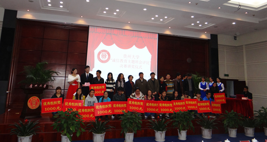 新闻网讯(生命科学学院钟灿辉报道|摄影钟灿辉理学院穆世林)为增强广大大学生诚信意识,提升大学生个人综合素质。12月4日,由贵州大学学生工作(部)处、贵州大学学生资助管理中心主办,贵州大学理学院承办的“诚信教育主题班会评比”决赛在北校区行政楼报告厅举行。为此,校长郑强专门为活动题写“诚信”二字,激励师生共创“诚信校园”系列活动迈向一个新的阶段。