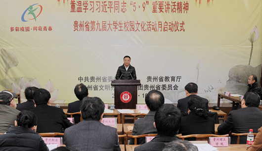 贵大新闻网讯(杨琴)3月10日上午,贵州省第九届“多彩校园• 闪亮青春”全省大学生校园文化活动月启动仪式在我校中国文化书院勉学堂隆重举行。省委宣传部副部长、省文明办主任朱新武,省委教育工委副书记李涛,团省委副书记徐锡广,我校党委书记姚小泉,党委副书记冯晓宪及省内40余所高校领导出席会议。省教育厅社政处处长鲁源安主持会议。