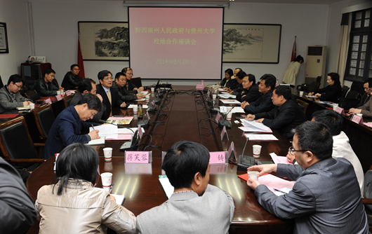 贵大新闻网讯(记者庞爱忠)3月20日下午,黔西南州人民政府常务副州长汤向前率队来校商谈继续深化合作事宜,黔西南州政府副州长曾孔祥,政协副主席黄健勇、黄榜泉,州政府秘书长刘兴吉,我校校长郑强,副校长金道超、刘勇,助理巡视员谢田凯出席,黔西南州农委、驻贵阳办公室、旅游局、人社局、设计院以及我校校办、宣传部、对外合作处、科学技术研究院、哲学社会科学研究院、旅游与文化产业学院、土木工程学院、材料与冶金学院、资源与环境工程学院、农学院、继续教育学院等单位负责同志参加。