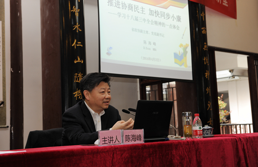 陈海峰副主席以“推进协商民主 加快同步小康”为题,结合公共管理学院的专业特点,深入阐释了党的十八届三中全会的深远意义,解读了坚持党的领导、人民当家作主和依法治国相统一这一理论的不可动摇性,论述了推进社会主义现代化改革的重要性。他强调指出,协商民主是我国社会主义民主政治的特有形式和独特优势,是党的群众路线在国家政治领域的重要体现,是一个不可动摇的根本制度。他还分别向大家阐释了“协商”、“民主”、“政治”和“群众路线”的不同意义。同时,他以大量的案例深入阐释了协商民主制度的重要性、现实意义、应用范围和领域。