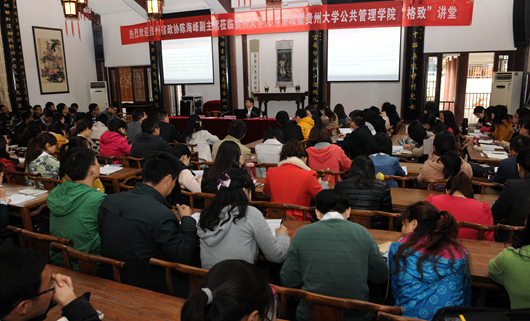 贵大新闻网讯(记者 王晓春)4月2日上午,贵州省政协副主席、党组副书记陈海峰受我校公共管理学院之邀,在我校北校区文化书院举办专题讲座,谈学习十八届三中全会精神的体会。校党委副书记任钢建主持讲座。