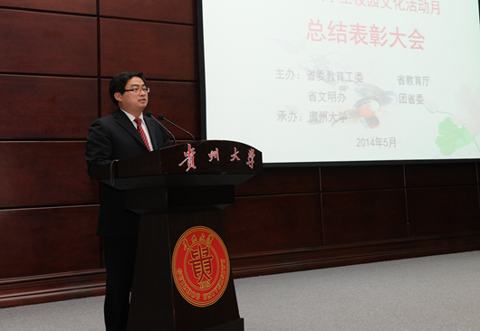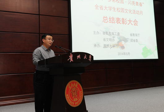 贵大新闻网讯(记者 扬琴 摄影 陈恒)5月8日下午,第九届“多彩校园• 闪亮青春”全省大学生校园文化活动月总结表彰大会在我校行政楼报告厅隆重举行。省委教育工委副书记李涛、省文明办副主任朱文东、我校党委副书记冯晓宪及省内40余所高校领导出席会议。团省委副书记徐锡广主持会议。