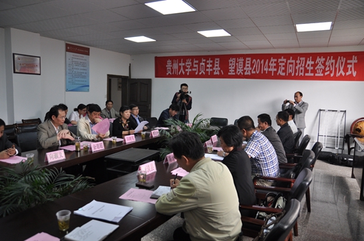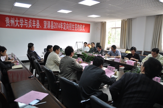 贵大新闻网讯(实习记者 田爱华)5月19日上午,贵州大学与贞丰县、望谟县2014年定向招生签约仪式在贵州大学招生就业处会议室举行。贵州大学党委副书记冯晓宪,副校长金道超出席签约仪式,贞丰县县委常委、副县长赵鑫,望谟县副县长陈维娟及望谟县相关部门负责人,我校相关职能部门负责人参加此次签约仪式。签约仪式由我校招生就业处处长惠淑林主持。