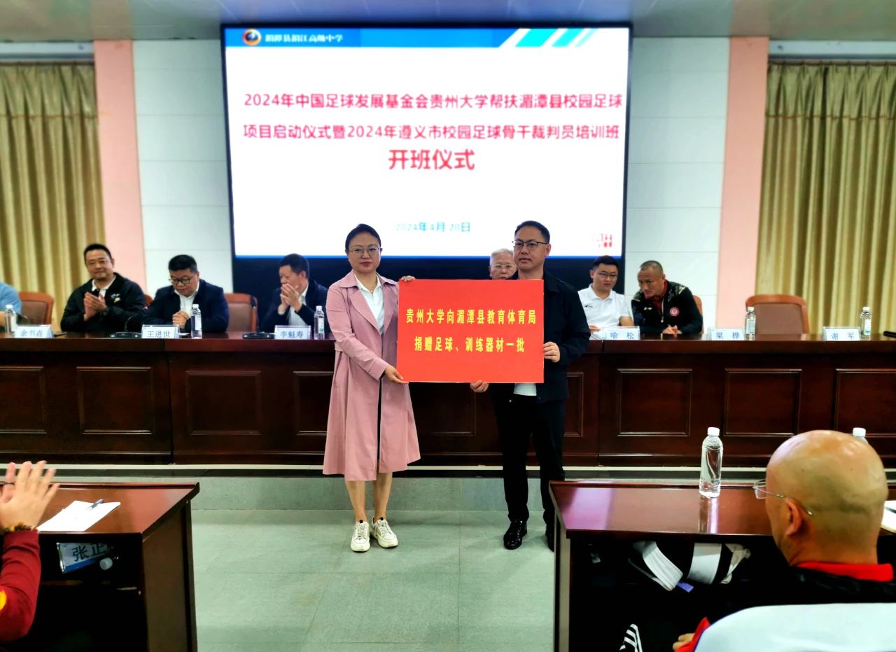 据了解,本次培训为期3天,由贵州大学派出的相关专家教师担任培训讲师,培训内容包括足球竞赛的组织与编排、足球竞赛规则与裁判法、足球基本技术、战术教学方法、青少年身心特点等内容。此外,贵州大学在未来帮扶湄潭期间,还将派出体育学院教师、学生到各校进行课程教学实践,从基本足球教学理论、足球游戏、校足球队训练、足球基本功训练、身体素质训练等方面进行详细指导,让更多学生参与足球运动,热爱足球运动。当天,贵州大学还向湄潭县教体局捐赠了一批足球及训练器材。