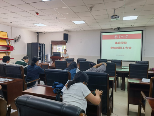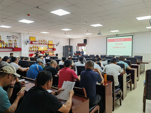 2024年5月22日,体育学院教职工大会在西区体育馆106会议室召开,会议内容包括党风党纪教育、师德师风专题教育、意识形态专题教育以及本科教育教学审核评估知识学习等。会议由学院党委书记洪影秋主持,学院领导班子及全体教工参会。