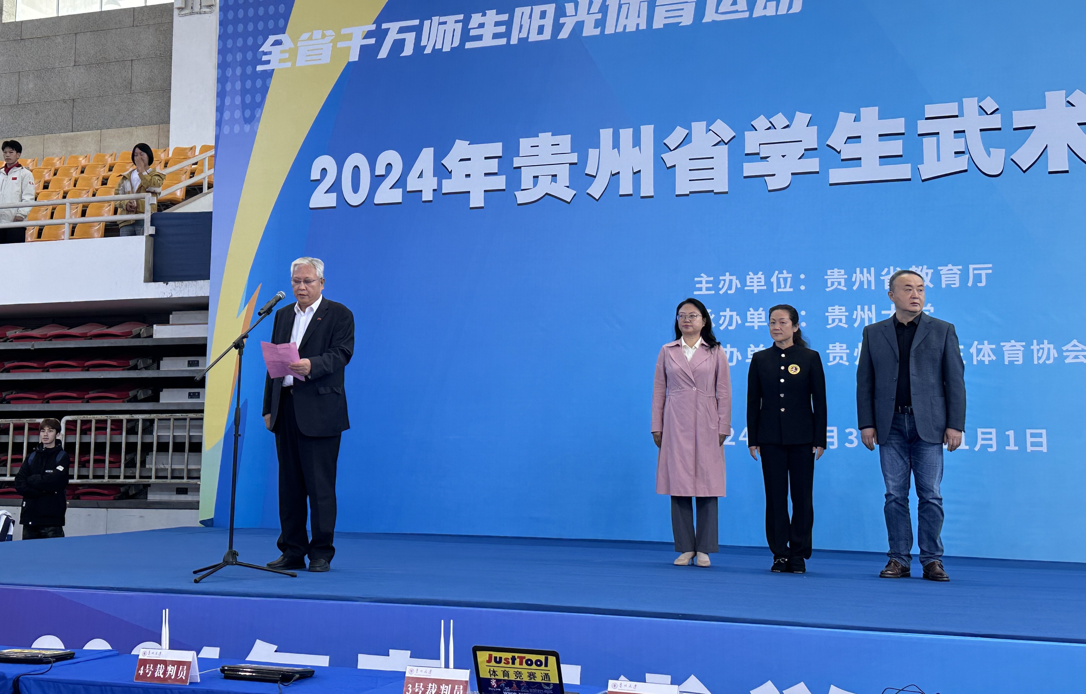 贵州省教育厅体卫艺处严卫一级调研员,贵州大学体育学院党委书记洪影秋、院长王华倬和比赛总裁判长赵艳霞出席锦标赛开幕式。开幕式由贵州大学党委正处级组织员陈朝东主持。