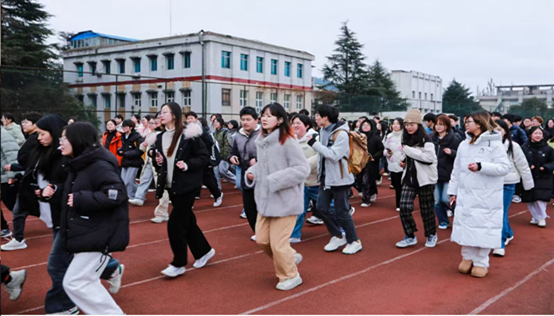 随着发令枪响,师生们以饱满的热情开启“长征杯”校园跑,围绕田径场完成6圈跑步任务。跑步结束后,健身教练带领全体人员进行柔韧拉伸,确保运动安全。与此同时,西一区与东校区田径场同步进行启动仪式。