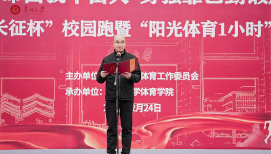 活动主会场设于西二区田径场,校领导、各职能部门负责人、各学院负责人及学生代表共同参与。副校长吴攀在致辞中强调:“我们要以科学运动强基,让体育重构成长逻辑。我们以‘长征杯’为名奔跑,就是用脚步去追寻那份红色记忆。”随后,优秀学生代表唐烽钦宣读《阳光体育倡议书》,号召全体学生坚持每日锻炼。世界体操冠军邓书弟作为领誓人,带领全场师生庄严宣誓,将活动推向高潮。