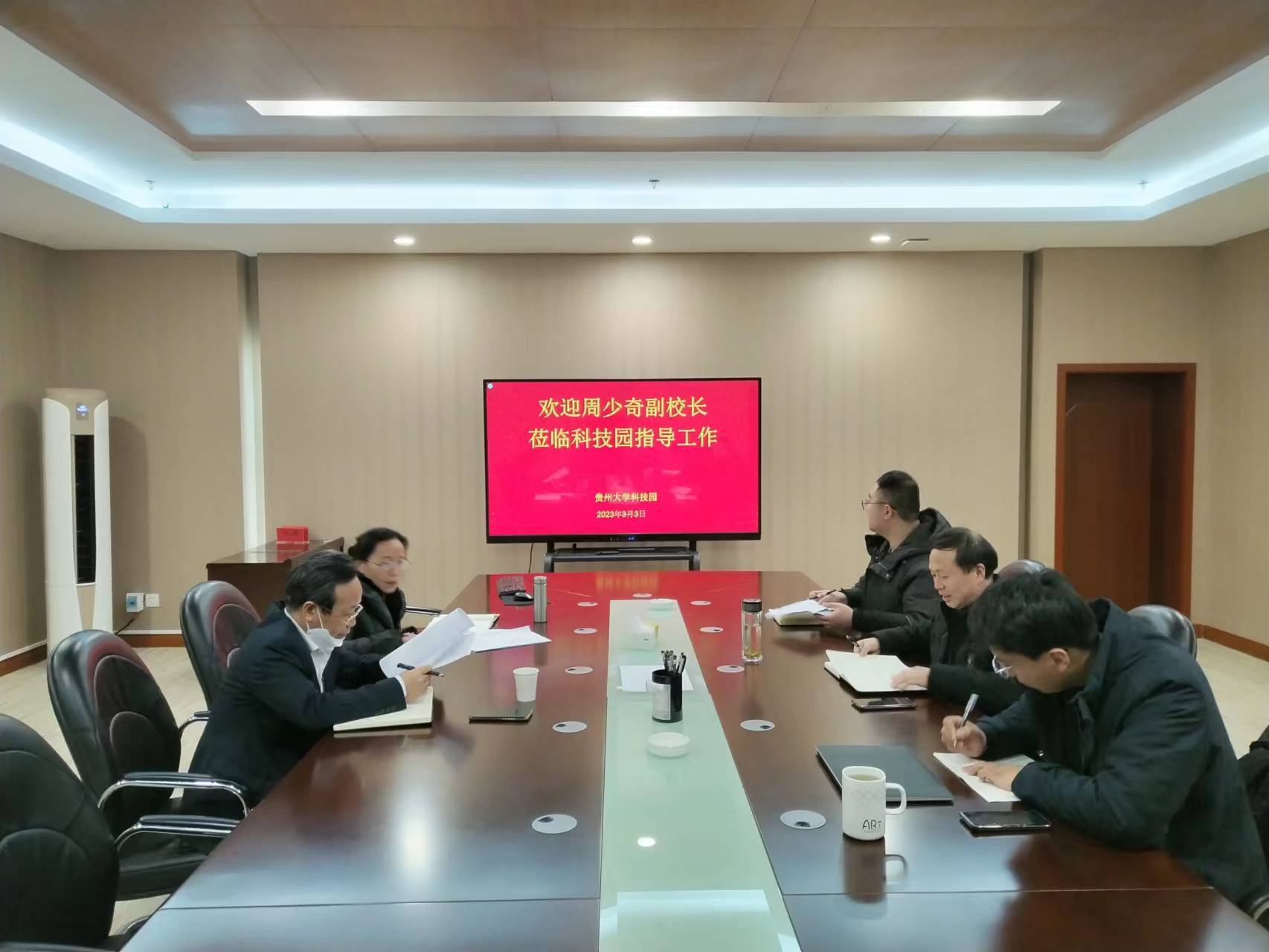 2023年3月3日下午14:30,贵州大学副校长周少奇到科技园调研,在明正楼科技园210会议室,科技园主任王爱华向周少奇副校长汇报了科技园的总体工作情况。