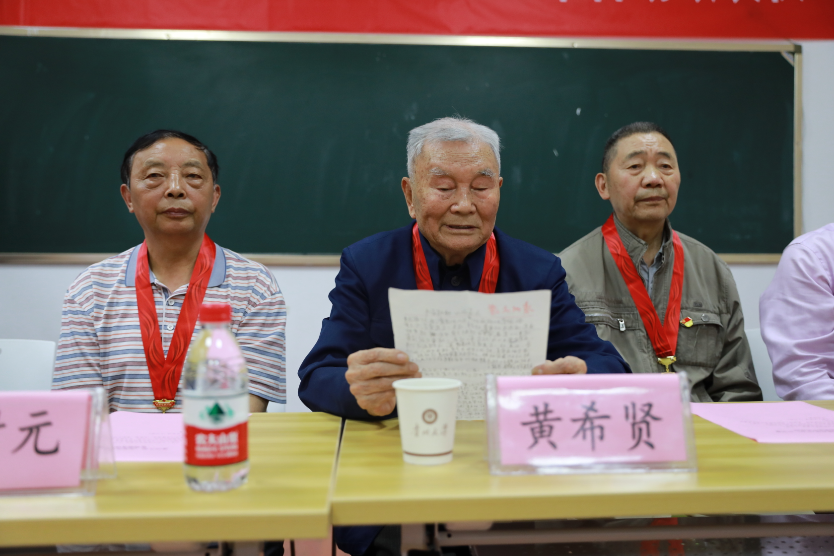 三位老党员先后分享个人加入党组织50多年的经历。92岁高龄的黄希贤老同志已光荣在党71年,他见证建党后的开天辟地,亲历新中国成立的改天换地,看到改革开放的翻天覆地。他从北京师范大学毕业来到贵州工作,几十年如一日,从来没有离开贵州,从来没有离开贵州大学,坚守三尺讲台,时时关心和支持学校的发展,被师生们看作“做事的旗帜、做人的堡垒、做学问的丰碑”。黄希贤老同志在发言中多次提到自己的座右铭:“活到老,学到老,改造到老,生命不息,奋斗不止,快乐生活每一天。”向在座的青年党员传达了积极向上的正能量。