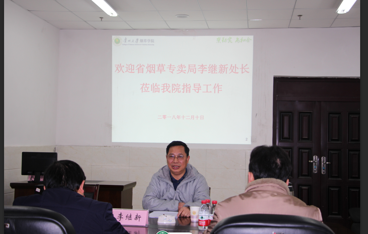 2018年12月10日,贵州省烟草专卖局科技处李继新处长莅临我院,在崇德楼烟草学院会议室,为全院教师举办了主题为“烟草发展与科技创新”的讲座。会议由院党委书记金春雷主持,院党政领导,各科室负责人及全院专任教师聆听了讲座。