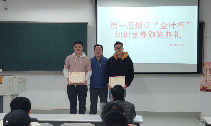 本次竞赛有幸邀请到烟草学院贺化祥、艾复清、彭剑涛三位老师以及烟草学院书记金春雷到现场进行指导。赛事于12月1日上午顺利结束,并进行了颁奖仪式。金春雷书记在颁奖仪式上对本次烟草知识竞赛进行了总结发言,他首先对获奖的同学表示祝贺;接着讲到此次竞赛很好的宣传了烟草学院,并希望“金叶杯”烟草知识竞赛未来越办越好;最后由金春雷书记为一等奖获得者颁发荣誉证书,颁奖结束后各位老师与参赛同学合影留念。